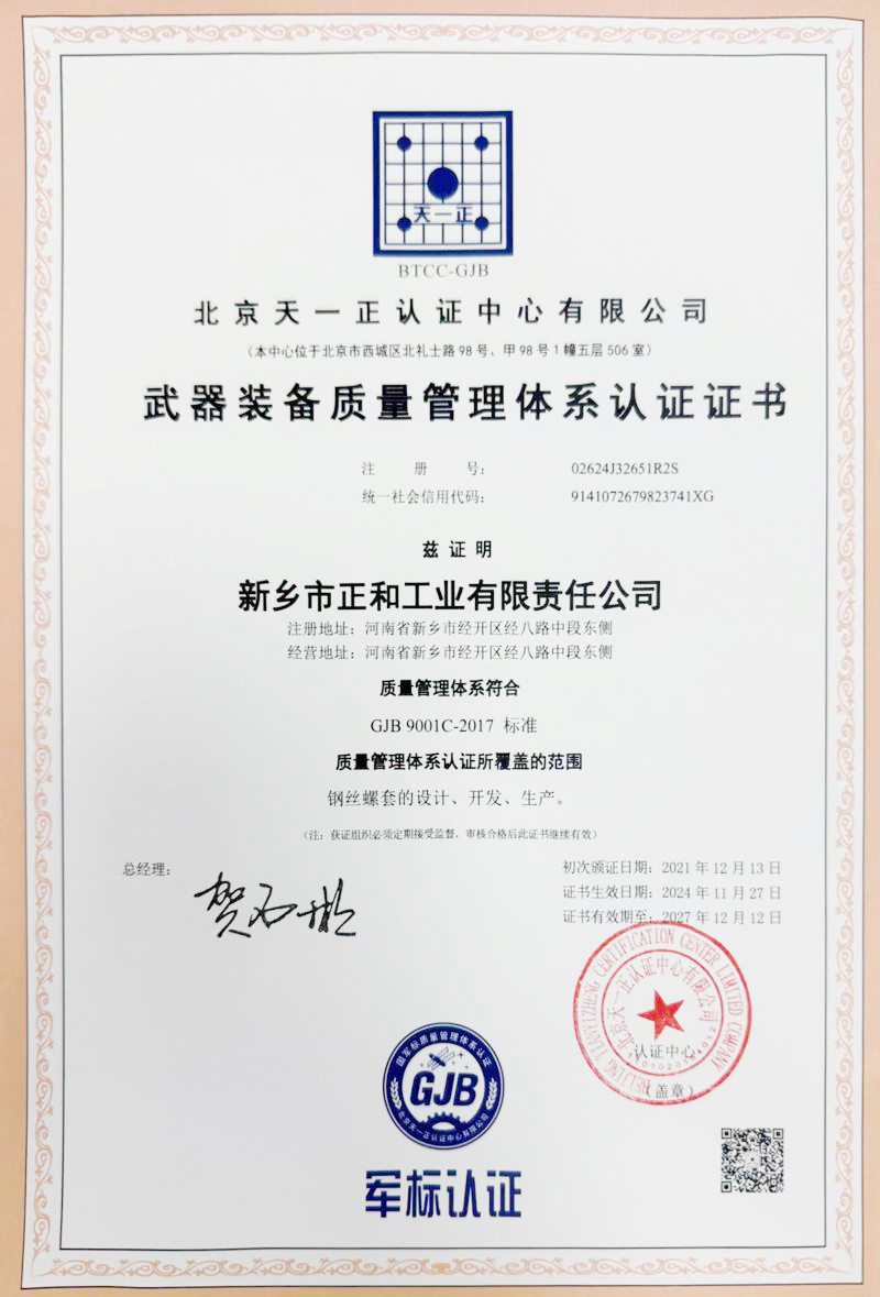 公司于2008年8月29日取得了中國新時代認(rèn)證中心軍工產(chǎn)品GJB9001B-2009質(zhì)量管理體系認(rèn)證證書,并繼續(xù)保持。